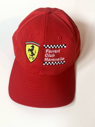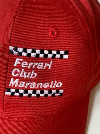 Cappello ufficiale del Ferrari Club Maranello. - Colore rosso vivace. - Logo Ferrari ricamato sul lato. - Dettagli a scacchiera e scritta Ferrari Club Maranello.