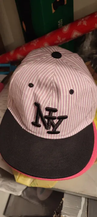 Cappellino con logo NY e visiera dritta. SENZA MARCA, L'HO MESSA A CASO SE NO NON ME LO FA INSERIRE - Design a righe. - Dettagli in rilievo sul logo.
