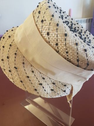 Cappello vintage in paglia italiana 1950 di colore beige,ricamato a mano con perline nere.Arricchito ed abbellito con nastro Grogren.Circonferenza cappello:50cm.Non ha alcun tipo di difetto o mancanza.Mai usato.