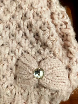 Cappellino in lana rosa per bambina, decorato con un fiocco e strass. - Morbido filato. - Dettaglio fiocco con strass centrale.