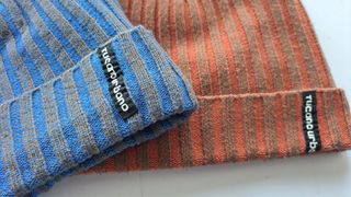 Set di due berretti Tucano Urbano in pile, molto caldi, felpati all'interno, taglia unica, il blu è nuovo - Un berretto blu con righe grigie. - Un berretto arancione con righe grigie. - Logo Tucano Urbano su entrambi i berretti.