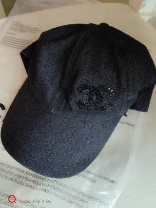 Cappello alla moda con logo Chanel decorato con strass. - Materiale denim. - Dettagli scintillanti.