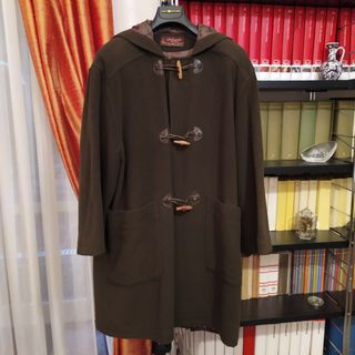 Fattura sartoriale, colore marrone, collo fisso in tinta;doppio petto, tasche laterali; maniche tipo raglan e spalline imbottite. Lunghezza totale circa cm 108. Completamente foderato in tinta. Taglia italiana 46/48. Modello classico dritto, usato poche volte.