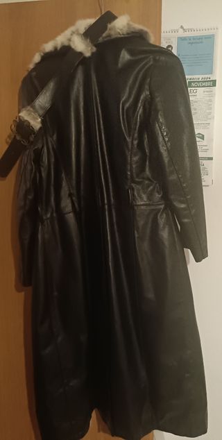 Cappottino altezza ginocchio con collo morbido tipo pelliccia,lunghezza dalla spalla cm90,larghezza sotto seno circa cm108 .Si abbottona e anche come in foto si chiude lateralmente sotto al collo!Cintura in vita ,usato ,veste una large!Tessuto panno,foderato internamente!Ha 2 tasche esterne.il prezzo tiene conto della spesa della tintoria dato che è un po' che è appeso nell 'armadio