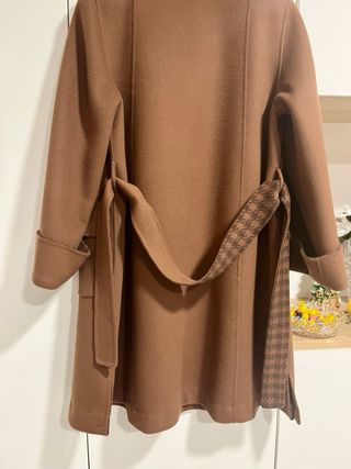 Cappotto doppiopetto lungo con reverse, taglio dritto con cintura, color cammello. 35% lana, 20% mohair, 20% alpaca; 15% poliammide; 10% poliestere. Fodera 100% poliestere. Taglia 44 ITA. Marca Sara Glenzer. Indossato poche volte, In perfette condizioni.