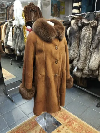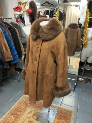 Elegante Montone Shearling Scamosciato da Donna, tg 44/46, Colore Marrone, con Folto Colletto e Polsi in Vera Volpe Naturale, Tasche Laterali e Chiysura con Bottoni sul Davanti. Perfettamente Rivestito all' interno di Caldo Montone Naturale Ideale per il Freddo dell':Inverno.