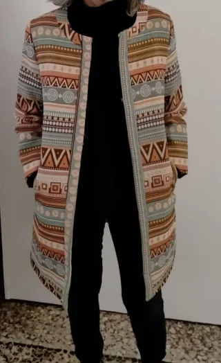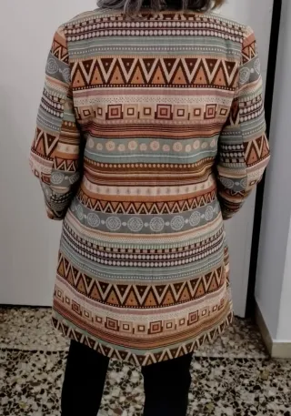 Cappotto leggero con un design etnico e colorato. - Fantasia geometrica e astratta. - Apertura frontale. - Maniche lunghe. - Due tasche - Chiusura tramite due piccoli ganci nella parte superiore