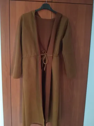 Cappotto lungo da donna, con cappuccio e cintura. - Tessuto tipo renna. - Chiusura con laccetto in vita. - Design aperto sul davanti.