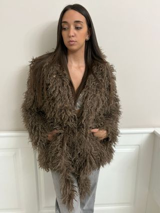 Elegante pelliccia da donna, modello Mongolia, in una calda tonalità marrone. Un capo che aggiunge un tocco di stile unico. - Design voluminoso e texturizzato. - Apertura frontale. - Lunghezza che arriva ai fianchi. top quality, ascella a ascella 55 cm spalla a spalla 55 cm lunghezza 60 cm nuova con cartellino, tessuto morbido, tg unica