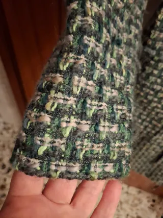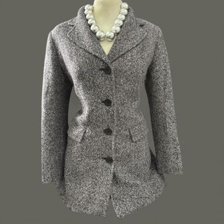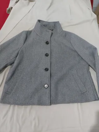 Cappotto sfoderato grigio con collo ampio, chiusura frontale con 4 bottoni, tasche sul fianco con apertura diagonale. Il tessuto che è di tipo bouclé, (40% lana, 55% poliestere, 5% acrilico) risulta morbido e avvolgente. Marchio Camomilla, taglia 42. Il capo è stato usato poche volte e non presenta segni di usura. Misure: distanza base del collo – orlo 78 cm, lunghezza manica 54 cm, torace 55 cm.