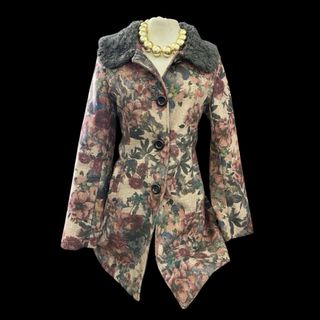 Elegante cappottino da donna con una vivace fantasia floreale. Presenta un colletto in pelliccia sintetica grigia e chiusura con bottoni. - Fantasia floreale su base beige. - Dettaglio colletto in pelliccia sintetica. - Chiusura frontale con bottoni.