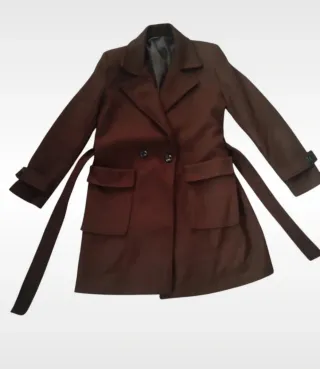 Elegante cappotto lungo da donna, perfetto per completare ogni outfit. - Chiusura doppiopetto con bottoni. - Cintura in vita per un fit personalizzato. - Design classico e raffinato. Il colore dal vivo e un marrone piu scuro . Bottoni colore oro