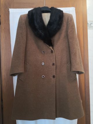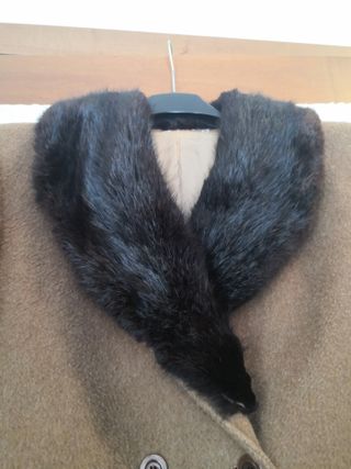 cappotto donna color cammello, bel tessuto alpaca e mohair con colletto in pelliccia. Modello classico 2 tasche, alcuni segni di usura all'interno, dove la fodera è stata parzialmente ripristinata (vedi foto), ma esternamente in buone condizioni. Taglia corrispondente IT 52/54