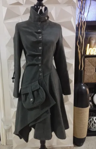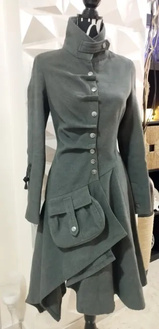 Particolare cappotto lungo invernale donna design asimmetrico Colore grigio Taglia sul capo 8 (S) Sul retro del cappotto presenta la possibilità di stringere/allargare il girovita tirando i due morsetti (Avevo rimosso la lunga etichetta interna non so indicare il tessuto, presumo sia panno battuto o lana viscosa) Chiusura bottoni frontali Possibilità di arricciare le maniche dal morsetto con laccio applicato. Elegante e stilosa giacca collo alto e balze frontali, tasca decorativa e funzionale con bottone Stile vittoriano svasato pixie moderno, con rifiniture e attenzione Pagato €165 Indossato solo 1 volta