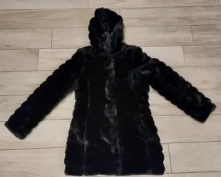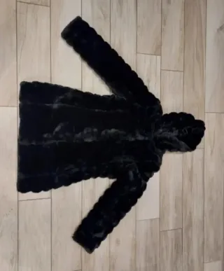 Pellicciotto nero Ecologico con cappuccio, caldo e morbido. Taglia M. Misure : lunghezza 80 cm e da ascella a ascella 48 cm