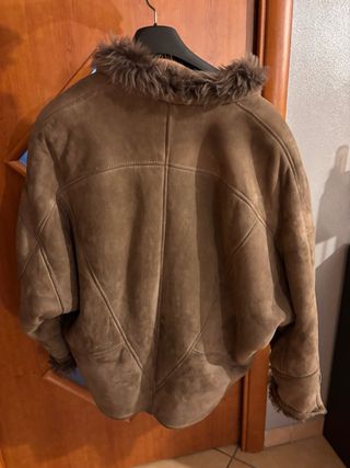 Elegante giaccone in montone scamosciato. - Fodera in pelliccia sintetica. - Chiusura con bottoni. - Tasche laterali.