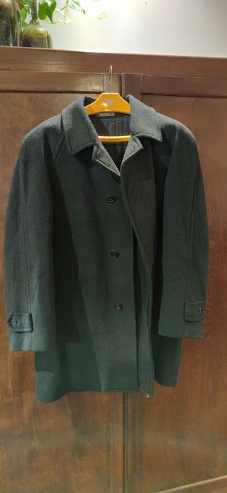 Cappotto dal taglio sartoriale leggero in lana e kashmir. Condizioni eccellenti, mai usato. Taglia 48 ma veste tranquillamente una L (nella foto indossato da me: 185 cm X 88 kg). Colore verde oliva. Made in Italy. Corneliani. - petto 60 cm - lunghezza 116 cm - colletto-> manica 78/80 cm - manica (cucitura inferiore) 44 cm