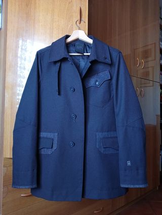 Giacca lunga in tessuto denim (50 lana 50 poliestere. Condizioni generali eccellenti, nelle ultime foto sono visibili due lievi segni. Taglia M, vestibilità slim. G-Star Raw.