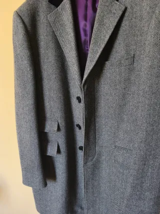 Elegante cappotto in lana Charlton Gray, taglia L. Un capo dal design classico con un tocco di colore. - Tessuto principale grigio con lavorazione a spina di pesce. - Fodera interna color viola acceso. - Colletto in velluto nero. - Chiusura con bottoni. - Tasche frontali applicate.