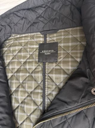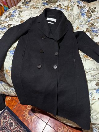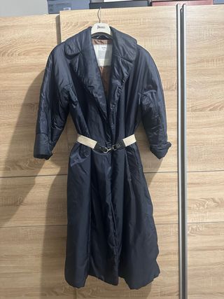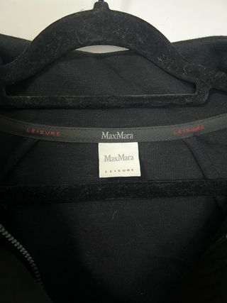 Abrigo de algodón Max Mara, color negro, talla M, en perfecto estado. Modelo con cremallera, cuello alto y el clásico detalle trasero de la marca con perlita brillante que lo distingue. Los cierres metálicos llevan la marca grabada, aportando un acabado premium. Como nuevo.