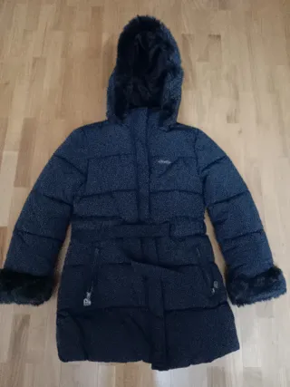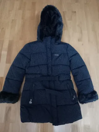Cappotto per bambini in blu navy, perfetto per tenere al caldo i più piccoli. Taglia 7-8. Caratteristiche: design imbottito, cappuccio con fodera in pelo, chiusura con cerniera, tasche laterali.