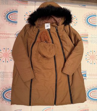 Giacca per il trasporto in colore marrone, ideale per portare il bambino con te. - Cappuccio per adulto e bambino - Tasca frontale con cerniera. - Cerniere laterali. - Può essere usata anche come normale giacca In ottime condizioni Ho anche maglione e maglietta per l'allattamento. Altri vestiti per bambini nel mio profilo.