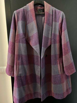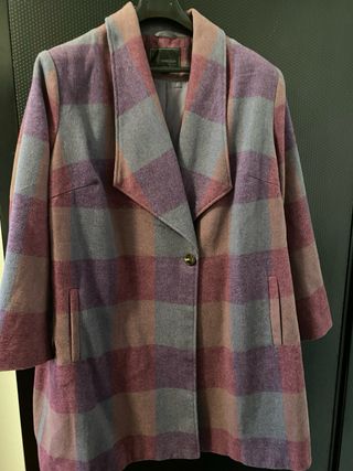 Elegante giaccone da donna foderato con un motivo a quadri. Un capo versatile per completare il tuo guardaroba. - Fantasia a quadri nei toni del grigio del viola e vinaccia - Design con collo ampio e revers. - Tasche applicate sul davanti. - chiusura con un bottone Non ha la cintura Misure Spalle 49 cm Giroseno 140 cm Fianchi 150 cm Lunghezza 97 cm