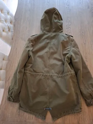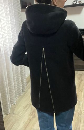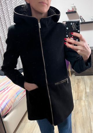 Elegante cappotto nero con cappuccio, perfetto per le giornate più fresche. La lunghezza arriva sotto i fianchi. Taflia M -42 - Chiusura con zip. - Tasche laterali con zip. - Dettagli con zip sulle tasche e nel cappuccio -zip posteriore per rendere cappotto avvitato o più lente