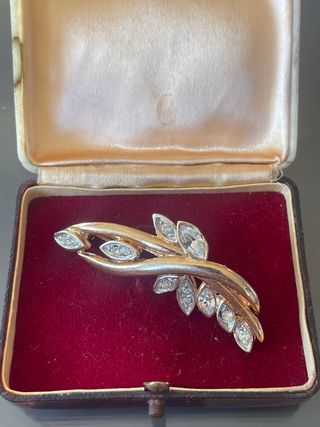 Elegante spilla vintage realizzata in metallo dorato finemente lavorato, impreziosita da luminosi strass che aggiungono brillantezza e raffinatezza al design. La lavorazione del metallo mette in risalto i dettagli e dona al pezzo un aspetto ricercato e senza tempo. La chiusura con sicura è perfettamente funzionante. La spilla è in ottime condizioni. Dimensioni: circa 4,5 x 1,5 cm. Un accessorio delicato e raffinato, ideale per abbellire giacche, cappotti, sciarpe o abiti, e perfetto anche per collezionisti di bigiotteria vintage. do Spedizione veloce, accurata e ben protetta. NB. La scatola è puramente a scopo fotografico, non in v