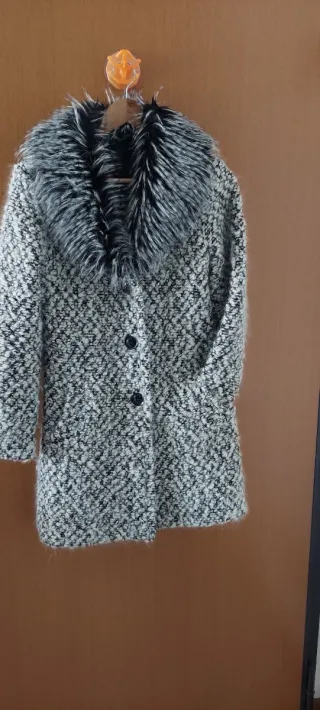 Elegante cappotto da donna in ecopelliccia, mai indossato. - Modello doppiopetto con cintura. - Collo ampio e bordi in ecopelliccia. - Fodera interna in ecopelliccia.