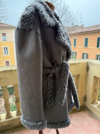 Elegante montone con dettagli in pelliccia. Cappotto in Montone, marca Shearling taglia 42 ma veste anche una 44. Caldissimo! Giaccone di alta qualità , ottimo stato Maniche. 58 cm Larghezza. 116 cm Lunghezza. 86 Cm Spalla a spalla 46 cm. Da notare nelle ultime foto le imperfezioni - Materiale scamosciato. - Fodera interna in pelliccia sintetica. - Collo e polsini rifiniti in pelliccia.