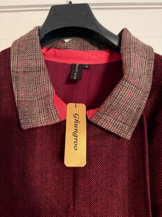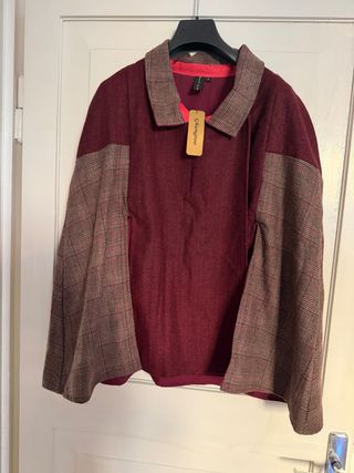 Cappa con un design unico e un colletto distintivo. - Tessuto principale bordeaux con inserti a quadri. - - Dettaglio del colletto a contrasto Bottoni al collo, spacchi sul pannello frontale per facilitare l’uso delle braccia, interamente foderata.
