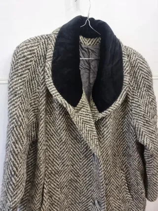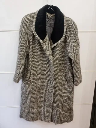 Elegante cappotto vintage Prestige Moessmer, realizzato in 100% lana vergine. Un capo classico con un design intramontabile. - Fantasia a spina di pesce. - Collo in velluto nero. - Fodera interna trapuntata.