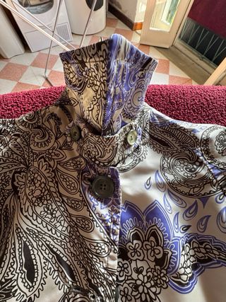 Elegante soprabito Etro con una vivace fantasia. - Fantasia floreale e paisley. - Colori: beige, viola e nero. - Chiusura con bottone.
