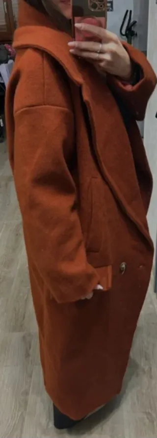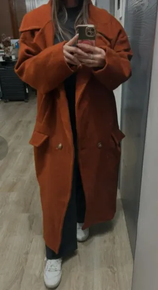 Elegante cappotto lungo in un caldo color ruggine. Il taglio over lo rende un capo versatile e alla moda. - Design ampio e confortevole. - Dettagli con tasche frontali. - Chiusura con bottoni.