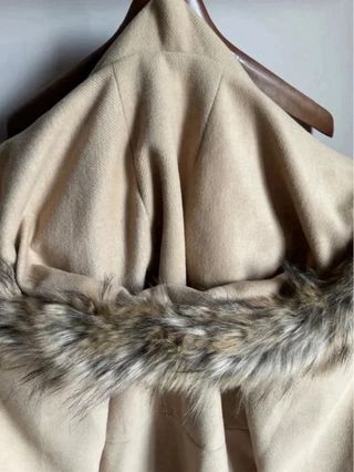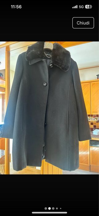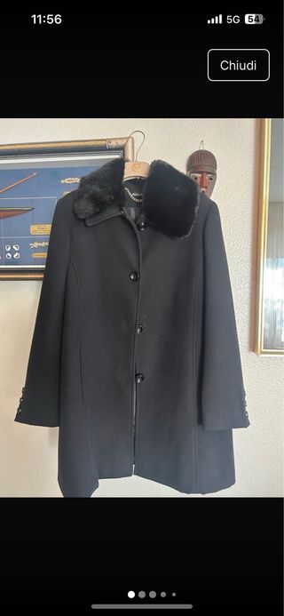Elegante cappotto o mantella di colore nero, versatile e di taglia 56 - Dettaglio con pelliccia sintetica sul collo. - Chiusura con bottoni. - Tasche frontali.