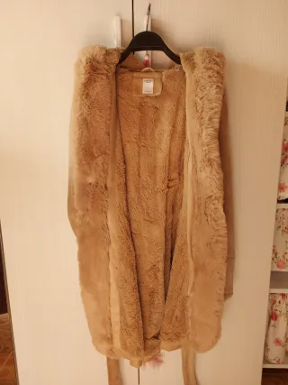 Elegante cappotto con dettagli in pelliccia sintetica. - Materiale esterno effetto scamosciato. - Fodera interna in morbida pelliccia sintetica. - Cintura in vita per una vestibilità personalizzata. - Cappuccio foderato in pelliccia. - Maniche lunghe con polsini in pelliccia. - Dettagli con nappe rosa.