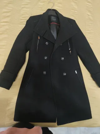 Elegante cappotto nero, perfetto per completare il tuo look. - Tessuto testurizzato. - Chiusura doppiopetto con bottoni. - Dettagli con zip. - Tasche frontali. - Collo ampio.