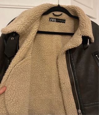 Elegante montone Zara con fodera in sherpa. - Colore esterno marrone. - Fodera interna beige. - Dettagli con fibbie e zip.