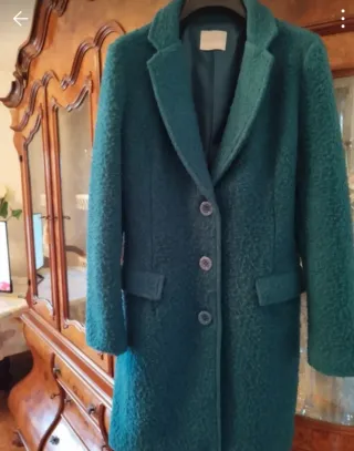 Cappotto da donna di colore verde. - Fodera interna lucida. Non imbottito. - Chiusura con bottoni. - Tasche laterali. Indossato un paio di volte, come nuovo. Molto carino.
