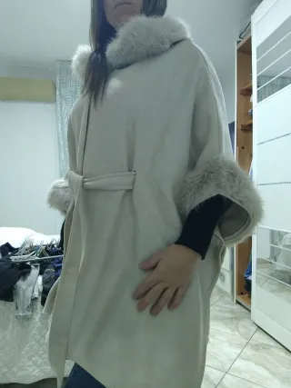 Elegante cappottino a mantella con finiture in pelliccia sintetica. - Morbido al tatto. - Cintura in vita per definire la silhouette. - Dettagli in pelliccia sintetica su collo e polsini.