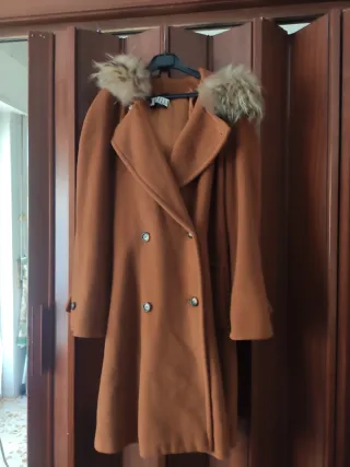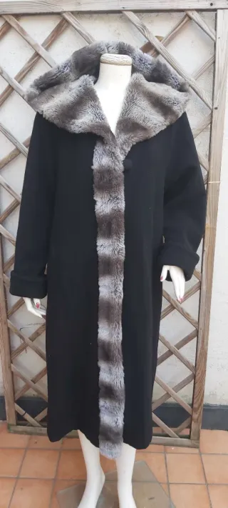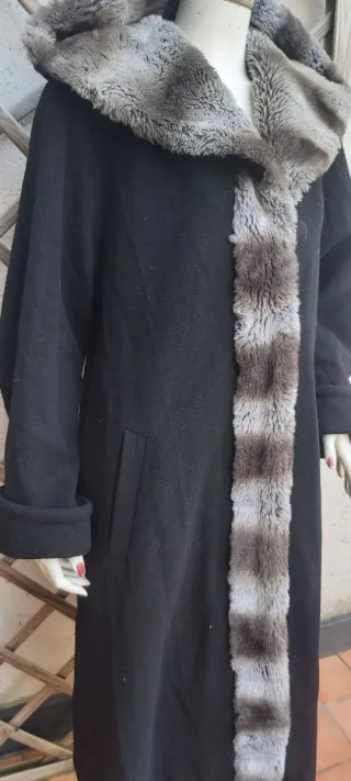 Elegante cappotto lungo con cappuccio bordato in pelliccia. La chiusura è centrale con un bottone. - Cappuccio bordato in pelliccia. - Dettagli in pelliccia lungo l'apertura frontale. - Polsini con risvolto. Modello ampio ,svasato a mantello,non ha Giro manica. Finiture in pelliccetta sintetica. Tg 48 italiana Giro seno 120 cm Giro fianchi 145 cm Lunghezza 112 cm