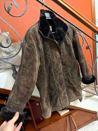 Elegante cappottino montone shearling, donna, realizzato in vera pelle scamosciata. Un capo bintage caldo e raffinato. Molto bello. Ben tenuto non ha strappi ne buchi, internamente integro. Usura del suo tempo. Tieni presente che sono capi vintage possono avere segni naturali del tempo.Ottimo rapporto qualità prezzo Per la taglia ho inserito misure in centimetri cosi da essere piu precisi. Misure: Ascella ascella cm 55 Spalla spalla cm 50,5 Lunghezza maniche partendo dal colletto cm 67,5 Lunghezza totale cm 82,5 - Prodotto di qualità - Capo vintage - Materiale esterno: vera pelle scamosciata. - Fodera interna in shearling.