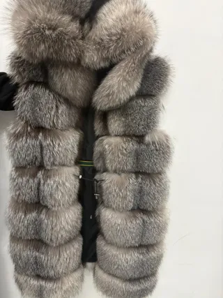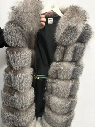 Elegante pelliccia di volpe argentata, un capo che aggiunge un tocco di lusso. Pelliccia volpe argentata taglia M / L chiusura con bottone gioiello e ganci a scomparsa, ottima vestibità e qualità - Chiusura con ganci. - Taglio morbido e voluminoso.