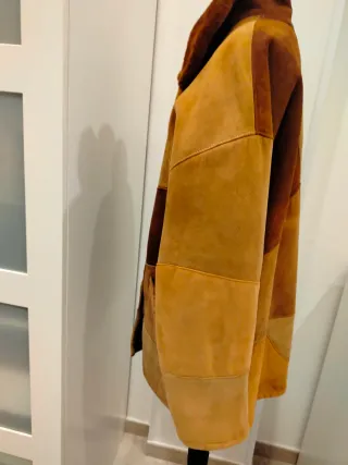 Elegante cappotto in shearling vintage con un design a pannelli, caratterizzato da un design a blocchi di colore o in patchwork in diverse tonalità di marrone e beige.Materiale: L'esterno è in pelle scamosciata (suede), mentre l'interno e il colletto sono foderati in shearling vera pelle di montone, noto per le sue proprietà isolanti. Stile: patchwork .Il colletto è ampio e peloso, un dettaglio comune nei capi vintage di questo tipo, a volte indicato come stile "Penny Lane" o boho/hippie. Capo scartellinato, artigianale e made in Italia, calza benissimo taglia 46 e 48 italiana, verificare misure in foto, in eccellenti condizioni