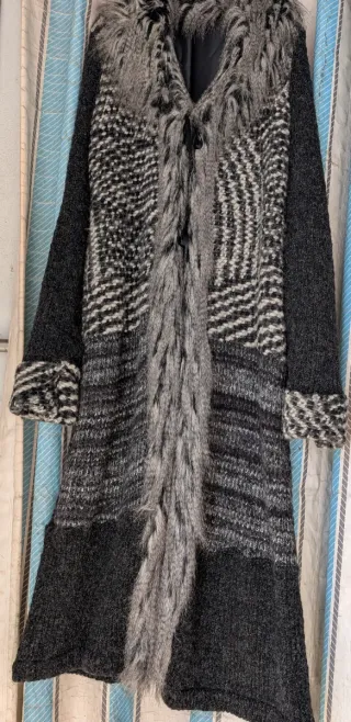 Elegante cappotto lungo in maglia, perfetto per completare il tuo look. - Design a cardigan. - Dettagli in pelliccia sintetica. - Fantasia a righe e zig-zag. - Polsini e fondo a contrasto.