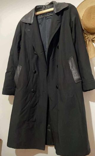 Elegante giaccone lungo, perfetto per completare il tuo outfit. - Colore nero. - Dettagli in pelle sul colletto e sulle tasche.