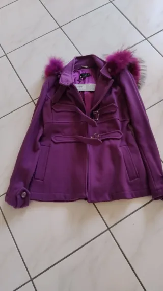 Cappottino viola, perfetto per le giornate più fredde. - Dettagli con fibbie e cintura. - Cappuccio con pelliccia sintetica viola. - Tasche frontali. - Bottoni decorativi sui polsini.
