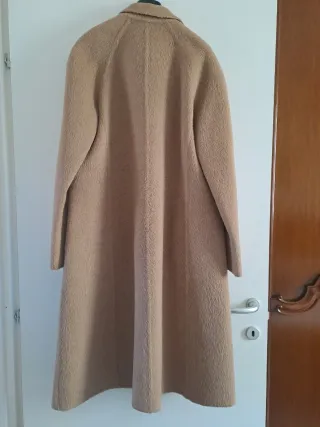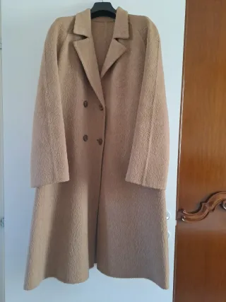 Cappotto vintage doppiopetto classico cammello con tasche laterali. Lunghezza 110 cm, spalle 45 cm, ascelle 54 cm, maniche 60 cm, vita 54 cm, fianchi 58 cm. Non ha l'etichetta della composizione del tessuto. Taglia 46 italiana.