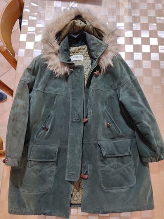 Cappotto montgomery da donna con bottoni e cerniera, imbottito vintage in pelle scamosciata di renna made in Italy, taglia 44 italiana.